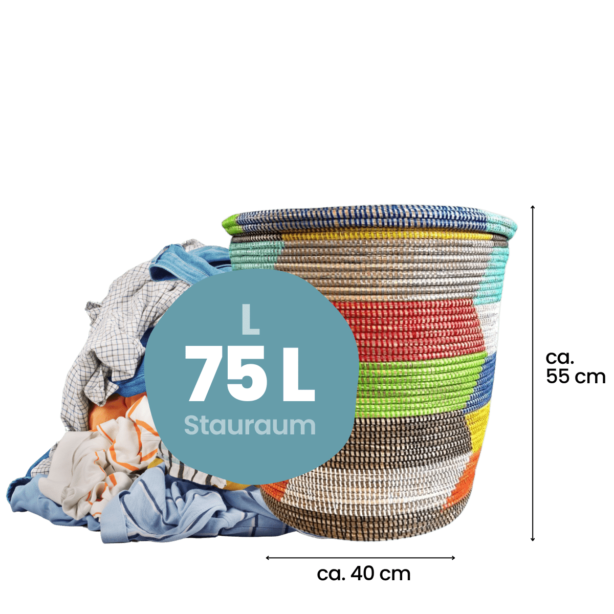 Das kunstvolle Flechten der Körbe in verschiedenen Design- und Farbvarianten zählt zum ältesten Kunsthandwerk Afrikas. Wäschekörbe aus dem Senegal sind bekannt für Ihre ausdrucksvolle Form und Farbgebung. Jeder einzelne Korb wird traditionell in Handarbeit aus Savannengras und recycelten Plastikstreifen geflochten! In Europa dient der senegalesische Wäschekorb meist zur Aufbewahrung von dreckiger Wäsche. In Afrika wird er als Schrankersatz für saubere Kleidung genutzt. Neben der Verwendung als Wäschekorb im Badezimmer eignet sich der Korb auch als besonderer Blickfang und Aufbewahrungstalent für Spielsachen, Decken, Überwürfe uvm.