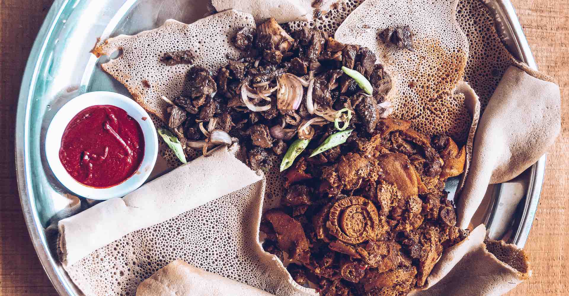 Injera ist das Herzstück der äthiopischen Küche und gilt als Nationalgericht. Dieses Fladenbrot wird traditionell mit Teffmehl zubereitet und dient als Grundlage für verschiedene Eintöpfe, Beilagen und Saucen. Es wird mit den Fingern der rechten Hand gegessen, was das Gemeinschaftsgefühl und die familiäre Atmosphäre beim Essen verstärkt.